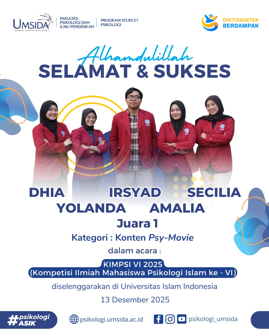 psikologi.umsida.ac.id — Pada tanggal 13 Desember 2025, Fakultas Psikologi Universitas Muhammadiyah Sidoarjo (UMSIDA) berhasil meraih medali emas dalam ajang KIMPSI 2025 yang diselenggarakan oleh Universitas Islam Indonesia Jogja (UII Jogja). Kompetisi ini merupakan sebuah ajang prestisius yang menguji kreativitas dan kemampuan mahasiswa dalam menciptakan karya dalam bidang psikologi. Dalam kategori Psy-Movie, tim dari UMSIDA yang...Read More
